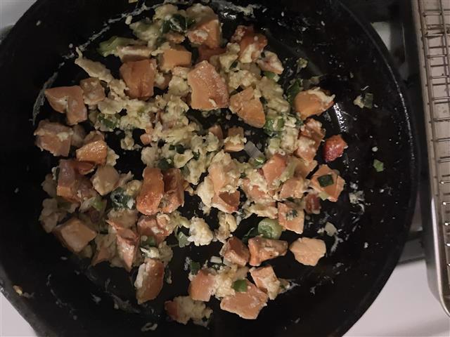 Here's the thoroughly steamed mushroom sautéing with garden fresh green onion and garlic and a free range egg.