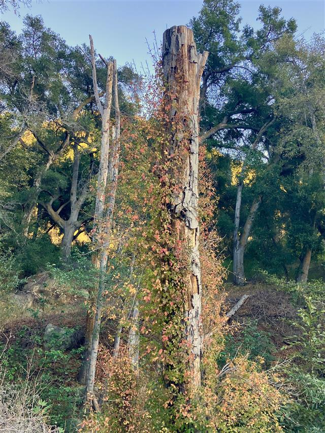 Poison Oak providing fall color on a White Alder snag. |