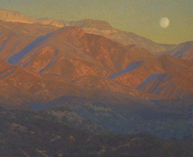 From the trailhead we’ll gradually walk about 1.5 miles on a well used dirt road with gradual elevation gain to a vista point above the Ojai Valley where we can watch the rising of the moon over the iconic Topa Topa Bluffs to the east amidst Ojai’s famed “pink moment.” At the same time, as happens during a full moon, the sun will be setting over the mountains to the west. These synchronistic, seasonal phenomena are beautifully captured in Ojai artist Jennifer Moses‘ oil-on-linen painting, “Sunswept.”