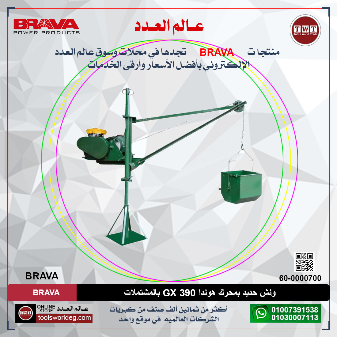 ونش حديد بمحرك هوندا 390 GX بالمشتملات – 2 براويطة + ا حلة + جيربوكس + 60 متر وير BRAVA