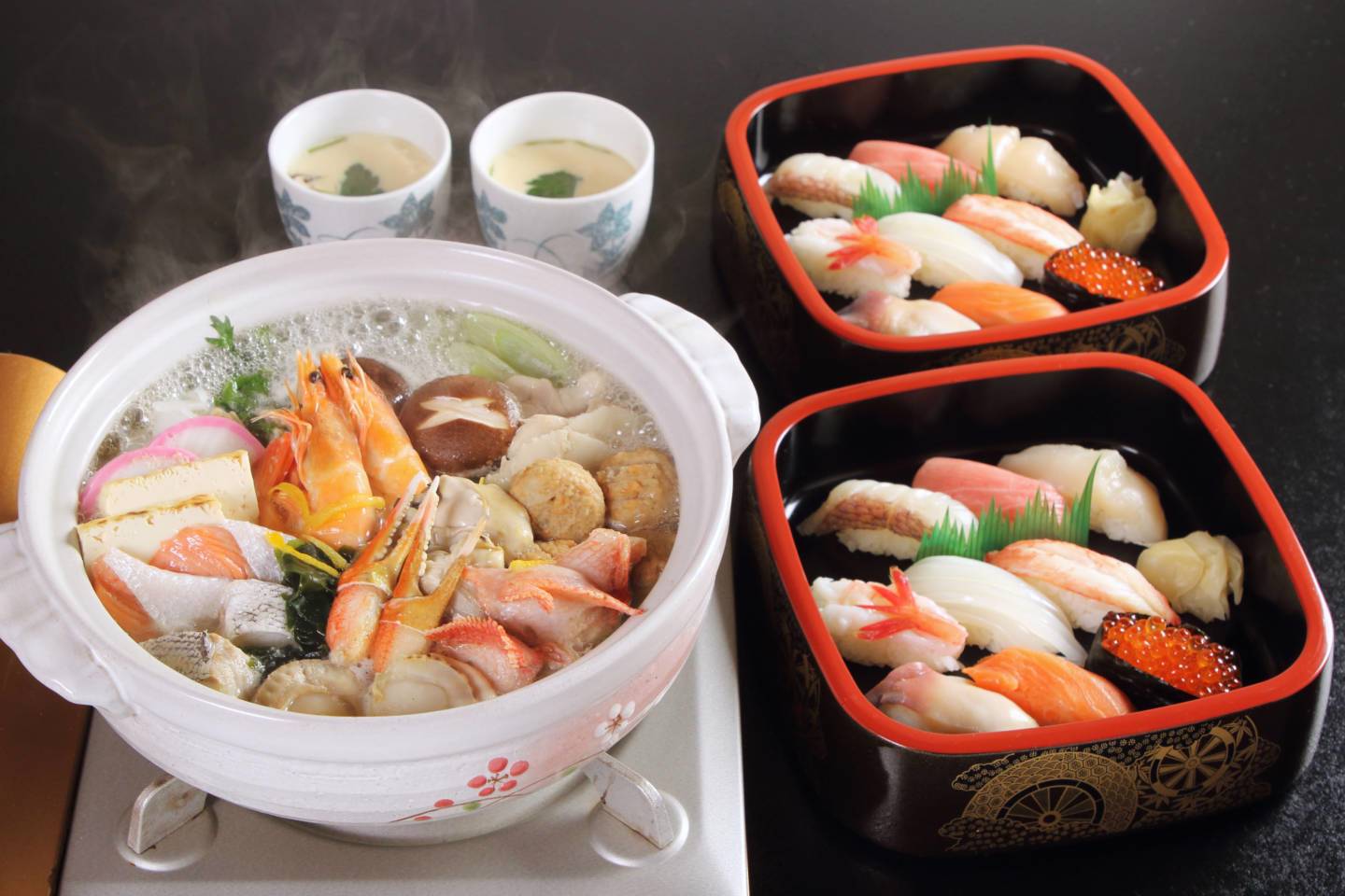 函館近郊の海の幸『握り寿司』と魚介の旨味がたっぷりの冬の味覚『寄せ鍋』。 老舗寿司店の味をお部屋で気兼ねなくお召し上がり頂けます。