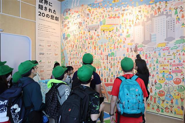 UNDPは、世界に隠された20の悲劇というユニークな展示を行いました。一見するとカラフルで楽しいイラストですが、よく見ると、貧困や格差、環境汚染など、20の「悲劇」が隠れています。 来場者の皆さんには、まるで“ウォーリーを探せ”のようにイラストの中から「悲劇」を見つけてもらい、開発課題について楽しみながら考えていただく展示となりました。 |