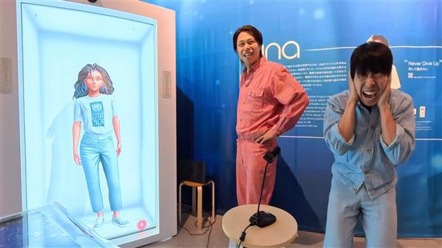 9月29日〜10月4日は、気候変動とグリーン・トランスフォーメーション(GX)をテーマにした展示を開催。環境啓発AIキャラクター「ウナ(Una)」との交流を通じて、来場者に環境問題について楽しみながら学ぶ機会を提供しました。お笑いコンビ「フースーヤ」を国連パビリオンにお迎えし、Unaと一緒に気候変動に対して一人一人が行動を起こすことの重要性を伝えました。 |