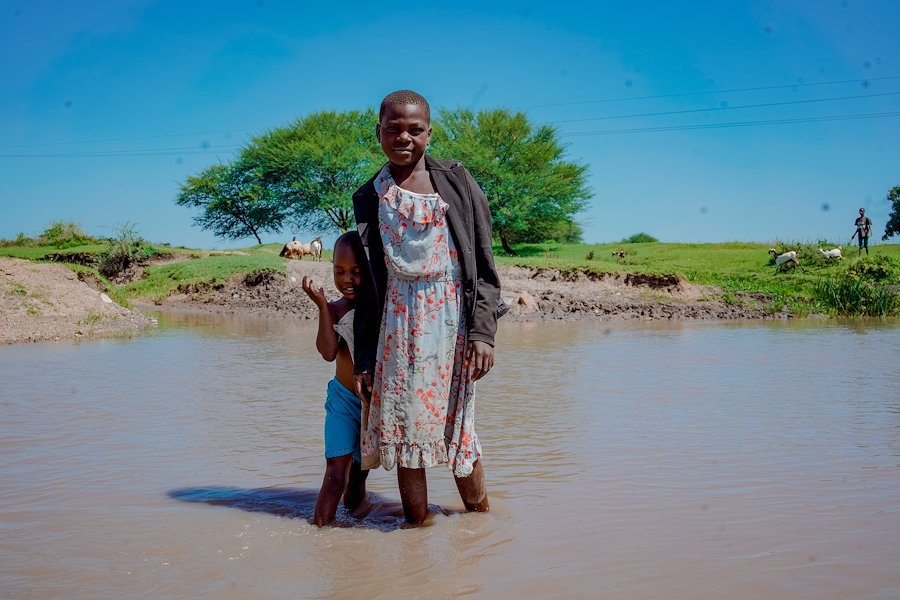 雨の降った田んぼで遊ぶタンザニアの子どもたち。実は田んぼに住む蠕虫(ぜんちゅう)を媒介として罹患する住血吸虫症のリスクにさらされています。