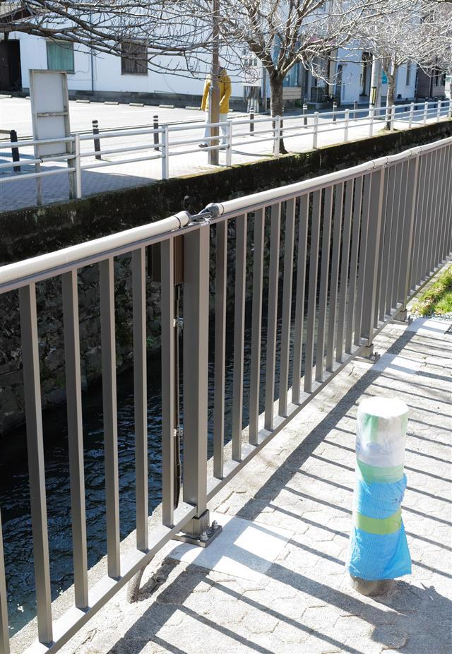僕らが作る転落防止柵には設計基準が定められいてそれをクリアしないと採用して貰えません。柵の頂部には笠木が必要でその強度も細かく設定されています。この現場の製品は「P-GT」という製品、笠木のサイズは幅75x高さ60です。これくらいの大きさがないと設計強度をクリアしません。笠木の内側は空洞になっています。そこで「この笠木を利用してフットライトの配線を通したらいいやん」って考えました。地中を掘って配線するより安価で既設の舗装材をいじる必要がありません。ナイスなアイデアでした。