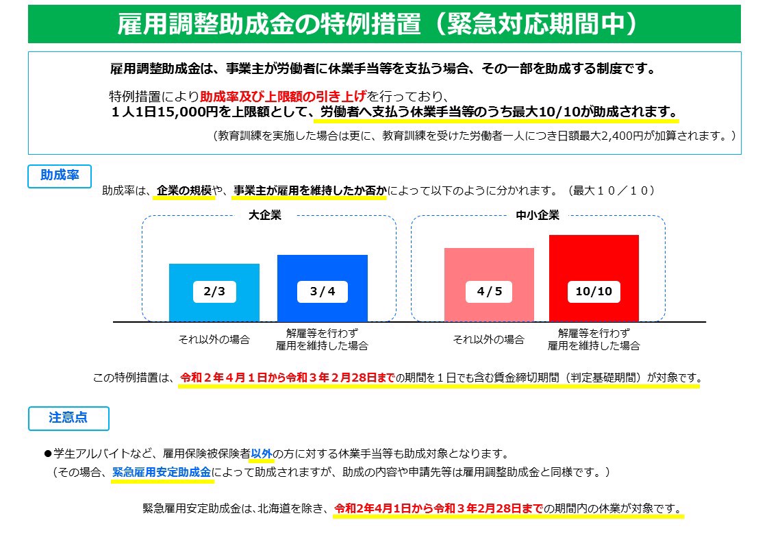 新型コロナウイルス感染症の現況を鑑みて雇用調整助成金の特例措置が令和3年2月28日まで延長されました。