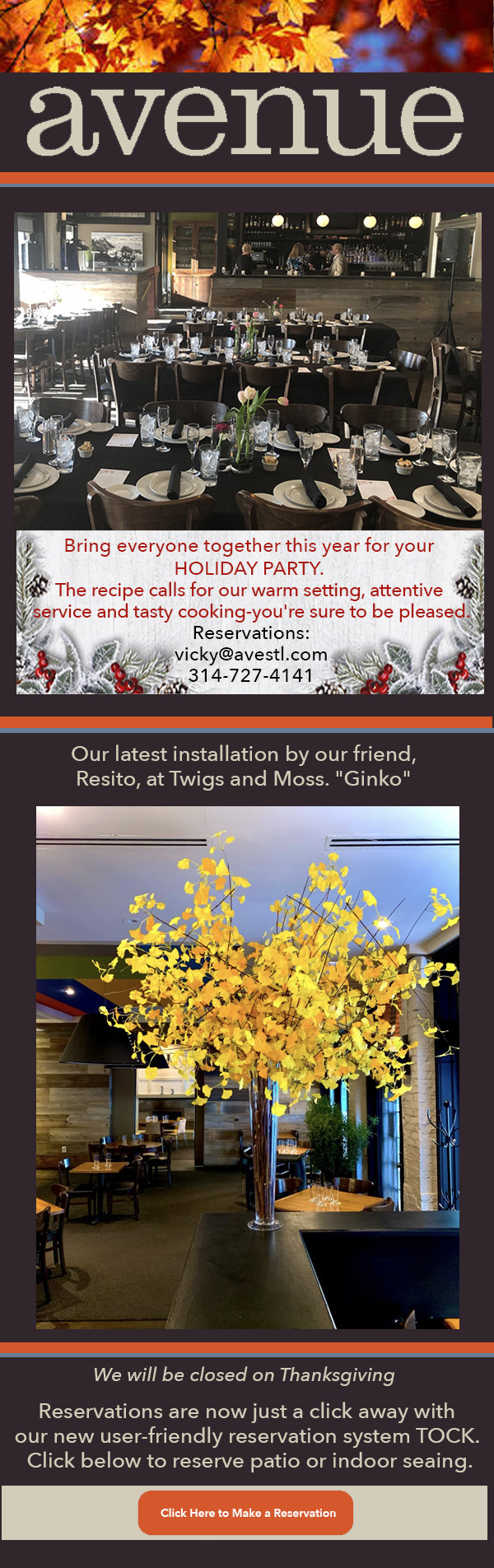 View this email in your browser You are receiving this email because of your relationship with Avenue and Atlas Restaurants. Please reconfirm your interest in receiving emails from us. If you do not wish to receive any more emails, you can unsubscribe here.