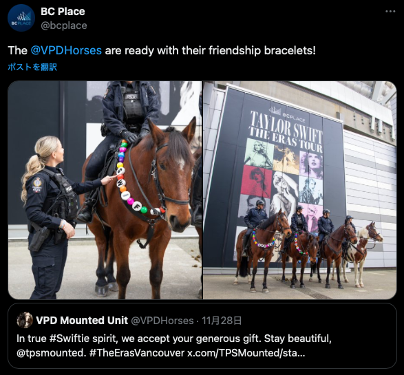 バンクーバーの騎馬警官もテイラー・スウィフトの「フレンドシップ ブレスレット」をかけてお出迎えの準備万端だそうです。