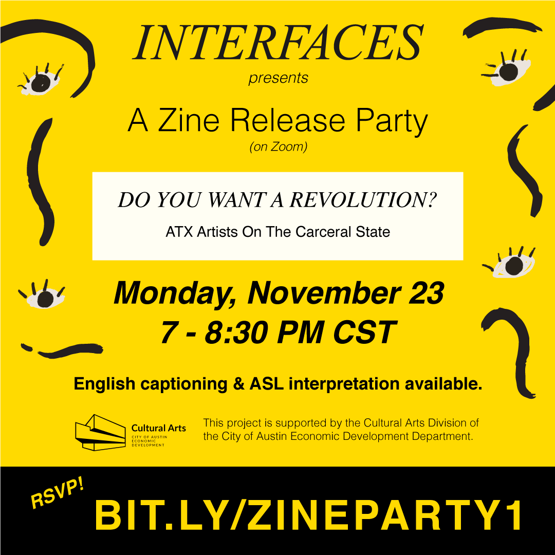 Join Interfaces on Monday, November 23, 7-8:30pm for the release of our zine, "do you want a revolution? ATX Artists on the Carceral State"! We'll have performances from zine contributors, words from our beneficiaries, and snippets of the zine presented by our designer :) RSVP at bit.ly/zineparty1