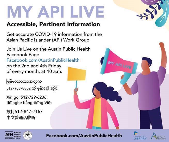 - Join Austin Public Health on Facebook Live at 10 AM to discuss accurate COVID-19 information for the Asian American Pacific Islander Community and friends. Topics will keep viewers up-to-date on resources for staying healthy, safe, and informed during the pandemic.