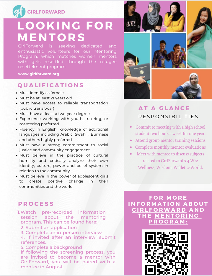Are you interested in working with and supporting high-school refugee girls? Then consider applying for GirlForward's mentoring program! GirlForward mentees are paired with female mentors for at least one year (and up to four years) so that they may have support in exploring their passions and graduate from high school. Mentor pairs meet weekly (6 hours per month) to talk about anything from school, to relationships, explore careers, try new activities together, and more. Mentors and mentees are friends, role models, teachers, and confidants for each other. Learn more and apply to be a Mentor here. |