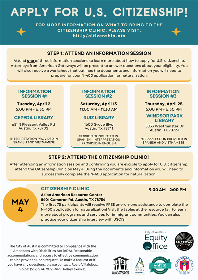 Citizenship Clinic. After the success of our clinics in 2023, we are working with American Gateways to bring you more citizenship clinics this year. Our Spring clinic will take place on Saturday, May 4th at the Asian American Resource Center. There is one more info session remaining before the clinic! You can find the details and links to flyers below & here. |