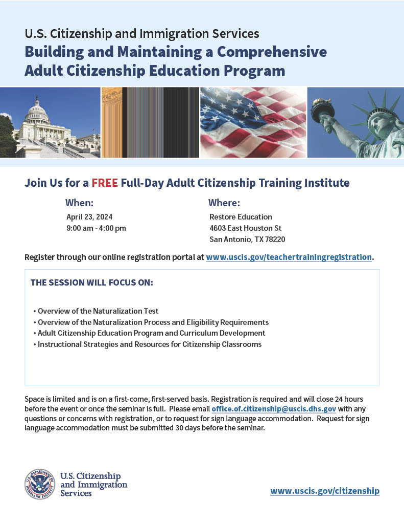 Join USCIS for a free, full-day adult citizenship education seminar! Topics to be covered: