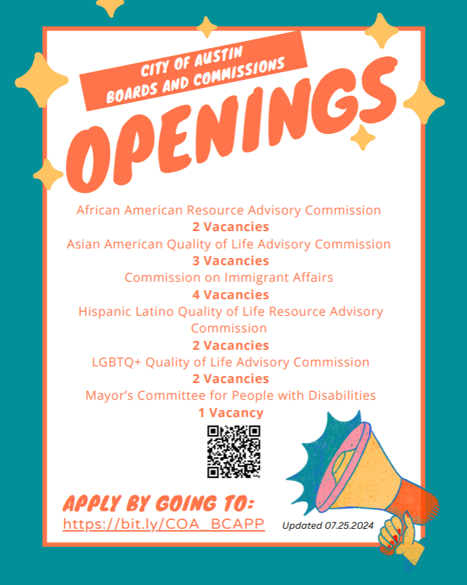 Boards and Commissions. Looking for ways to get involved in your community? Consider applying for a position on one of the City's many commissions! These bodies are important in that they enable the public to participate in Austin's government processes. Their activities help shape and influence public policy because they lend a more diverse viewpoint for the City Council to consider. Check out the vacancies listed below and apply here. The Commission on Immigrant Affairs has a great need for new commissioners!
