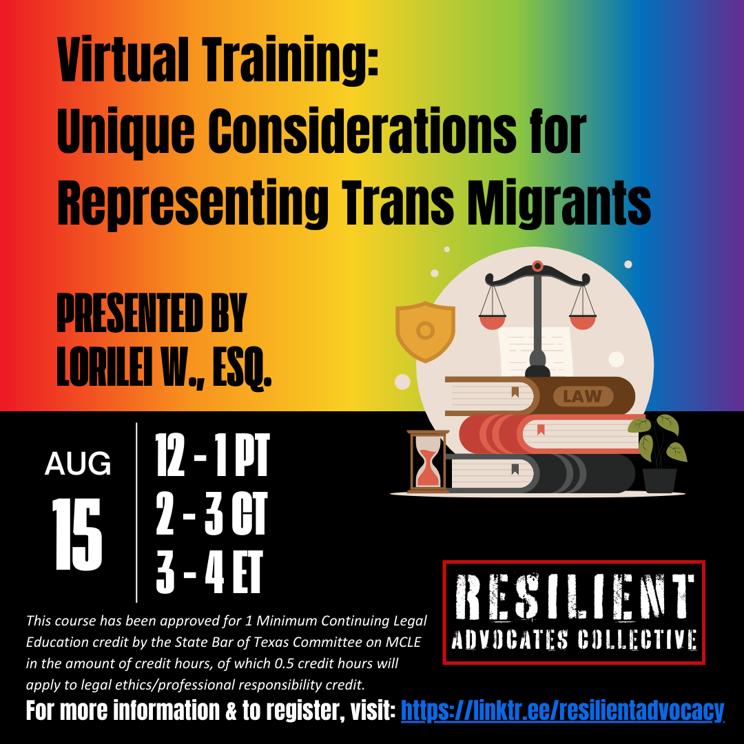 Representing transgender migrants isn’t just about getting your client’s pronouns right - it’s also about innovative legal strategy. This training is designed to equip you to represent trans migrants competently, zealously, and creatively. This course has been approved for 1 Minimum Continuing Legal Education credit by the State Bar of Texas Committee on MCLE in the amount of credit hours, of which 0.5 credit hours will apply to legal ethics/professional responsibility credit. Register here. |