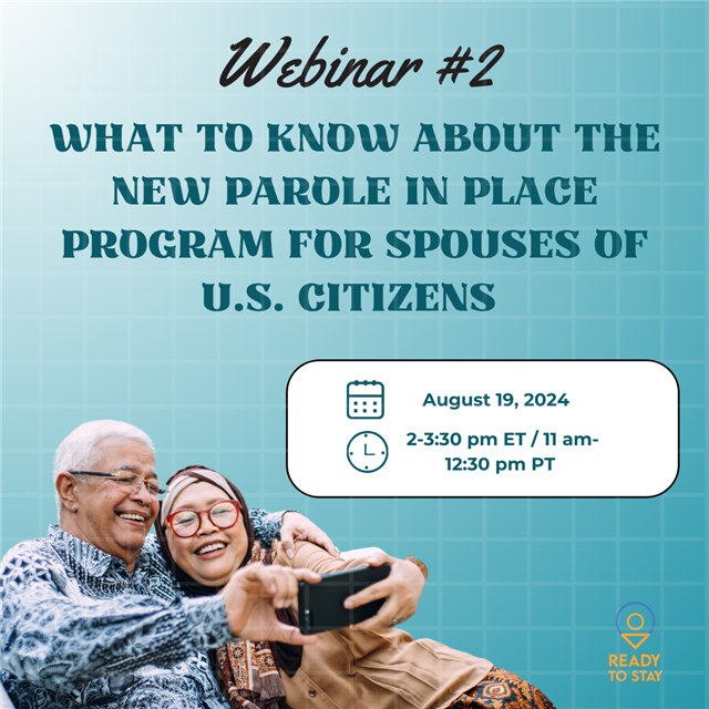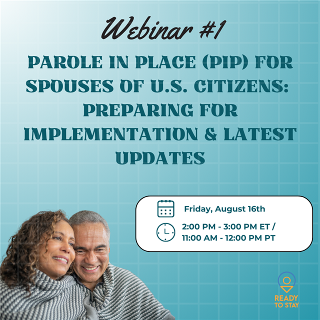 Join partners of the Ready to Stay coalition to hear the latest updates on what we know around the (Parole in Place) PiP application process, how organizations are preparing for implementation and resources available for organizations. Learn more and register here. |
