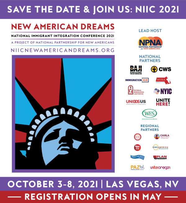 [Image Description: A digital flyer that states at the very top, "Save the date and join us: NIIC 2021" Below that it states, "New American Dreams. National Immigrant Integration Conference 2021. A project of national partnership for new Americans." There is a URL: niicnewamericandreams.org. Beneath the URL is an illustration of the Statue of Liberty's face. To the right of the image are a list of various partners. At the very bottom it states, "October 3 - 8, 2021 Las Vegas, NV. Registration Opens in May."] |