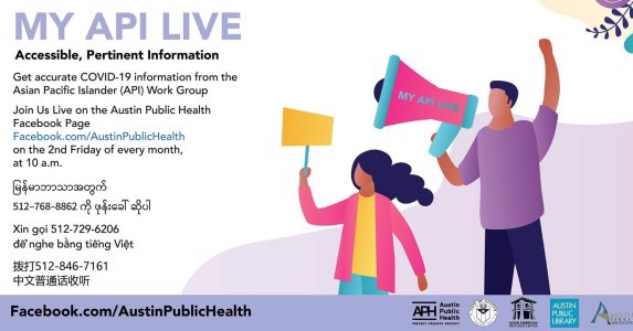 [Image Description: A digital flyer with a white background. To the right are two people, one with a megaphone and another holding up a sign. To the left of them, there is text that reads, "My API Live. Accessible, Pertinent Information. Get accurate COVID-19 information from the Asian Pacific Islander (API) Work Group. Join us live on the Austin Public Health Facebook Page: Facebook.com/AustinPublicHealth on the second and fourth Friday of every month, at 10 am." Below that are texts in Asian languages with phone numbers to call in to the language lines. At the very bottom of the flyer is the Facebook URL again, and the logos of Austin Pulic Health, City of Austin, the Asian American Resource Center, Austin Public Library, and Parks and Rec.]