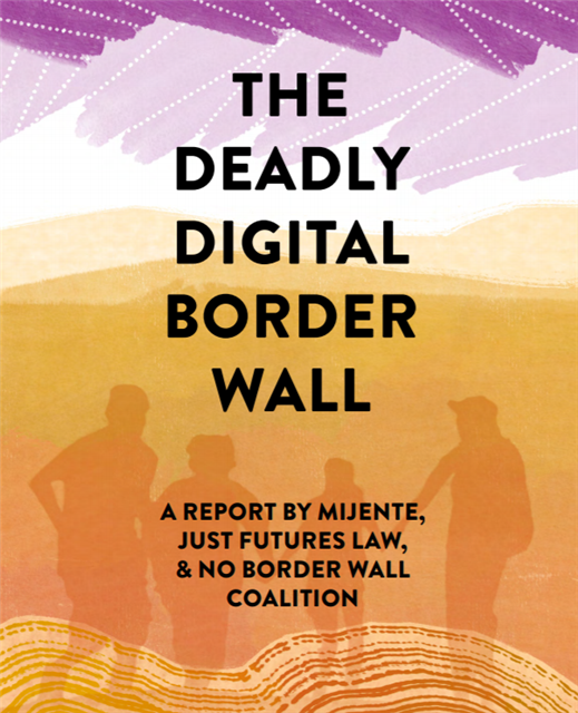 [Image Description: A cover for a report. The background for the report has outlines of people and splashes of the colors purple, yellow, and orange. On the cover, it reads "The Deadly Digital Border Wall: A Report by Mijente, Just Futures Law, and No Border Wall Coalition."] |