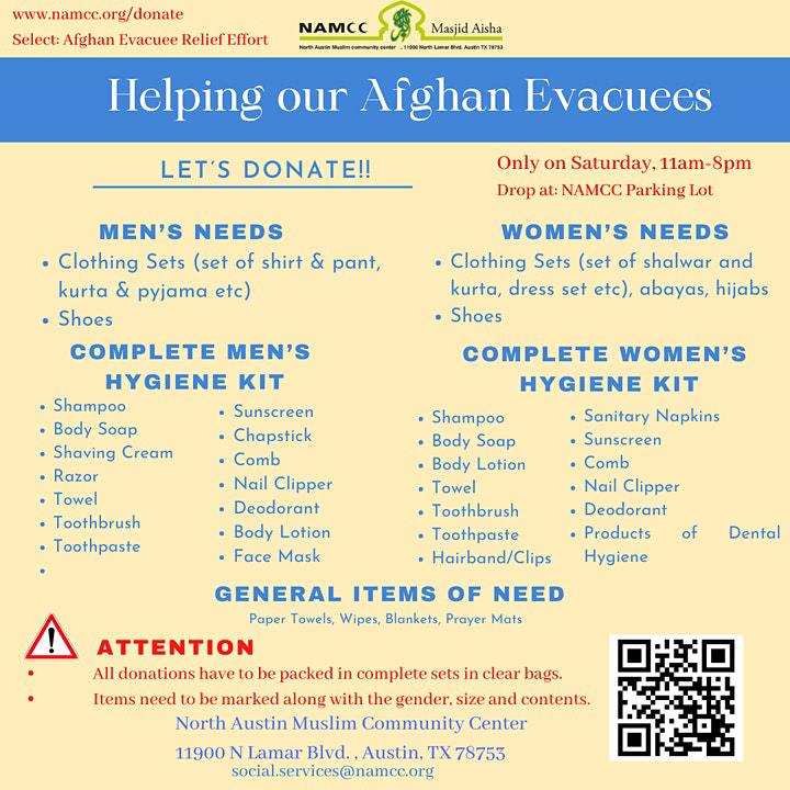 Donation Drive for Afghan Arrivals hosted by the North Austin Muslim Community Center