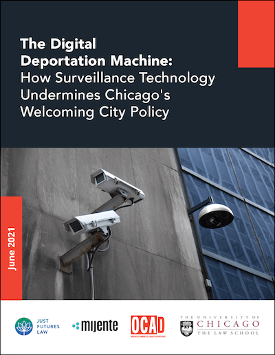 [Image description: A cover for a report. In the middle is a photograph of various security cameras installed on a building, monitoring the public. At the top, it reads "The Digital Deportation Machine: How Surveillance Technology Undermines Chicago's Welcoming City Policy." At the bottom, it has the logos for the organizations involved in the report, including Just Futures Law, Mijente, OCAD, and the University of Chicago Law School."] |