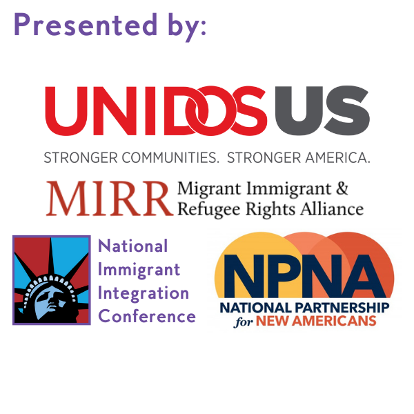 [Image Description: A series of logos of the organizations presenting the webinar. At the top, it reads "presented by" and beneath that includes the logos of the following: Unidos US, Stronger Communities, Stronger America; MIRR Migrant Immigrant & Refugee Rights Alliance; National Immigrant Integration Conference; NPNA National Partnership for New Americans."] |