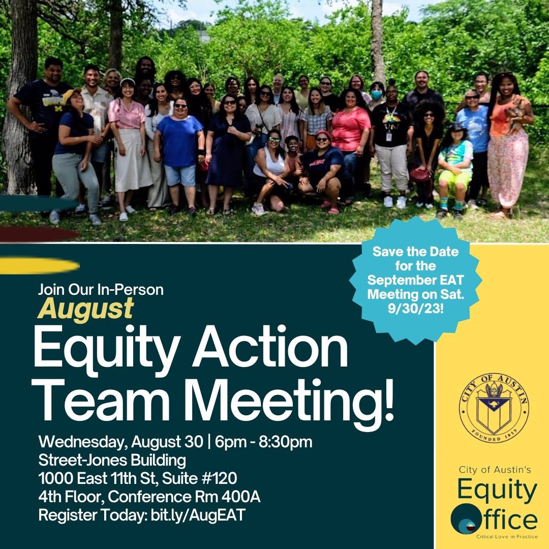 We are excited to have you for our in-person August EAT meeting! Please join us Wednesday, August 30, 2023 from 6pm to 8:30pm. We'll connect over a delicious dinner and get our meeting started by 6:30pm.