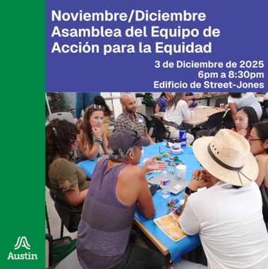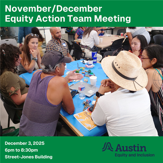 The Equity Action Team (EAT) is a coalition of community members and City of Austin staff focused on advancing racial equity in our communities through partnerships with City departments, non-profits, philanthropic entities and community-based groups.