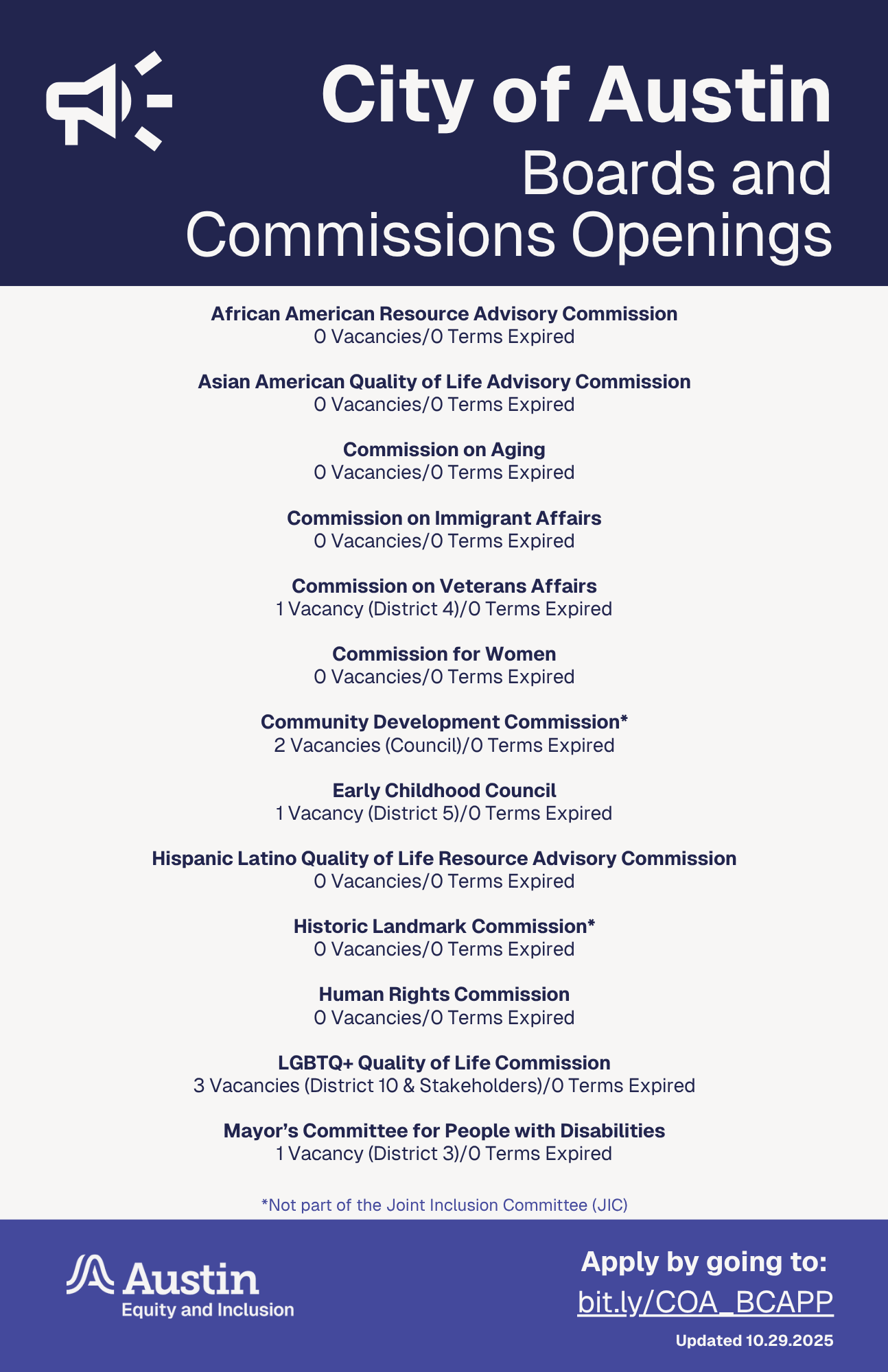- Immigrant, Refugee, and Foreign-Born QoL Study: Launched in October 2024, this study is a partnership between the City and the National Center for Farmworker Health. In collaboration with the Commission on Immigrant Affairs Workgroup, the team has begun a community-led research process to better understand the experiences and needs of Austin’s immigrant, refugee, and foreign-born residents.