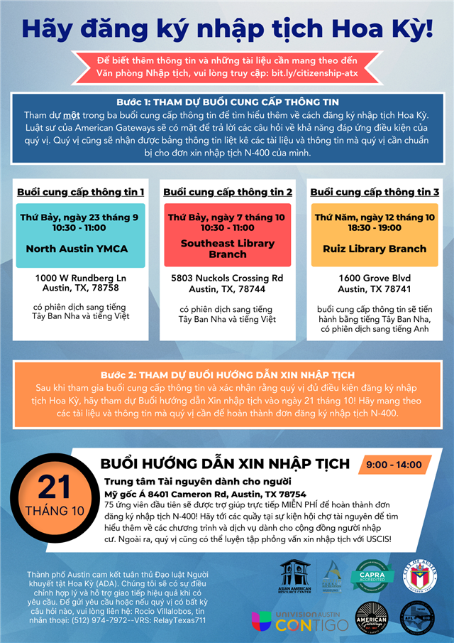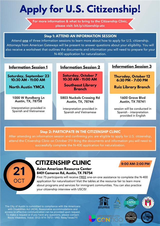 The City of Austin's Equity Office and Asian American Resource Center are partnering once again with American Gateways and Texas AFL-CIO to host a citizenship clinic on Saturday, October 21, 2023 at 9:00 AM. The first 75 people in line will receive free one-on-one assistance to complete the N-400 application for naturalization. Registration will take place from 9:00 - 10:00 AM on the morning of October 21.