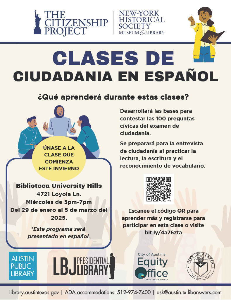 Citizenship Classes in Spanish. We are excited to launch our first series of citizenship classes in Spanish this year! The classes will run from Wednesday, January 29th - Wednesday, March 5th and be held on Wednesday evenings from 5-7pm. Please share the flyer below with people who may be interested! Sign up here for the classes or email rocio.villalobos@austintexas.gov to get registered. |