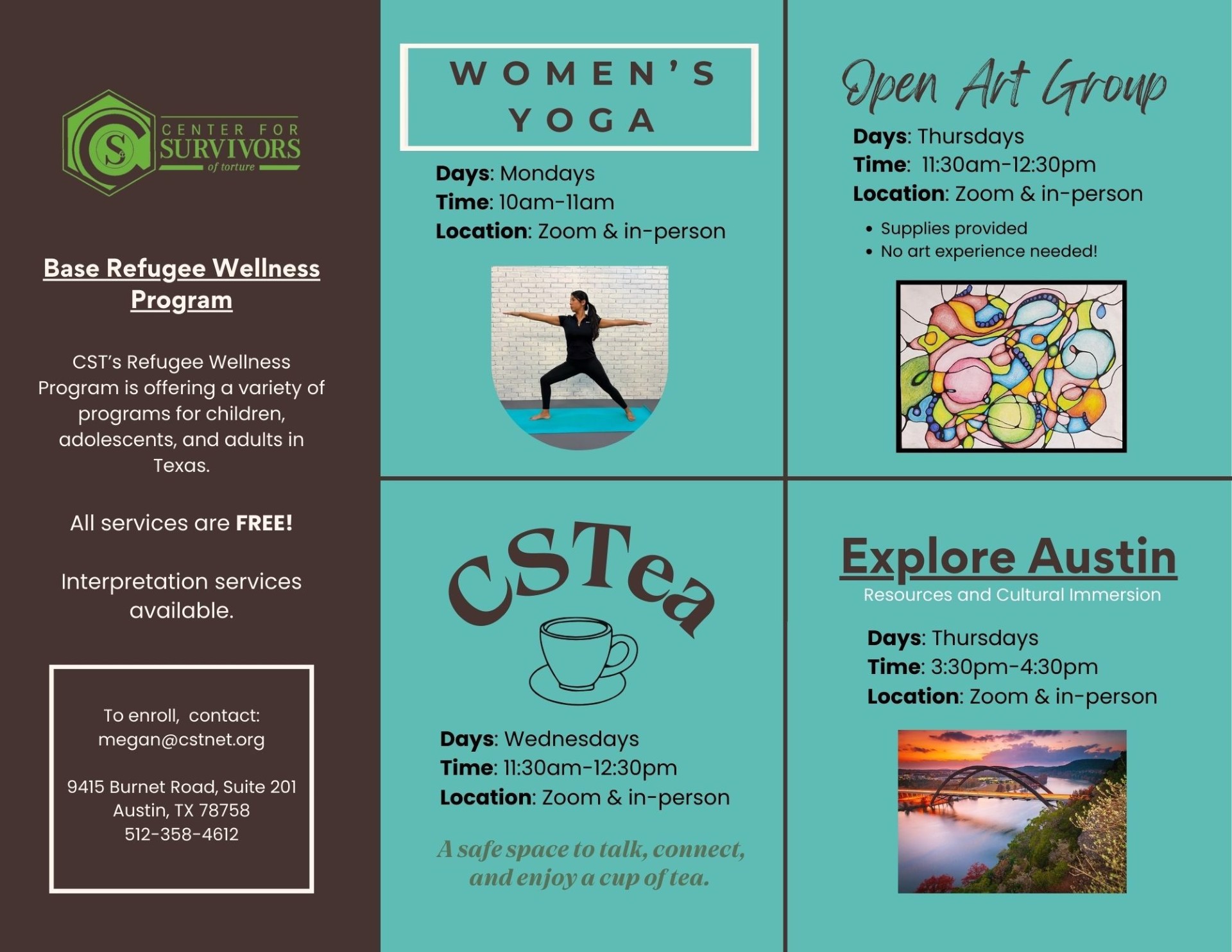 The Base Refugee Wellness Program (BRWP) at Center for Survivors of Torture (CST) is accepting new referrals! BRWP helps refugees and asylees by offering a variety of FREE services including weekly groups, case management, and peer support to promote wellness and support systems in the US. Interpretation services are always provided. The referral process is simple. Please send the following information to Megan Sissom, LMSW, megan@cstnet.org - individual's name, contact information, and primary language.