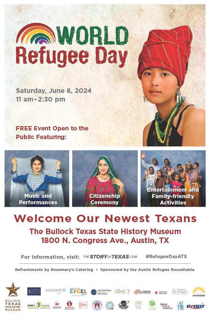 Established by the United Nations in 2000 and first celebrated on June 20, 2001, World Refugee Day raises awareness of the plight of refugees throughout the world. Austin will celebrate World Refugee Day on June 8 this year-earlier than the UN designated International World Refugee Day on June 20. This celebration, sponsored by the Bullock Museum and member organizations of the Austin Refugee Roundtable, celebrates new American citizens and recognizes the courage and resilience of refugee families and individuals. The event is free and open to the public. |