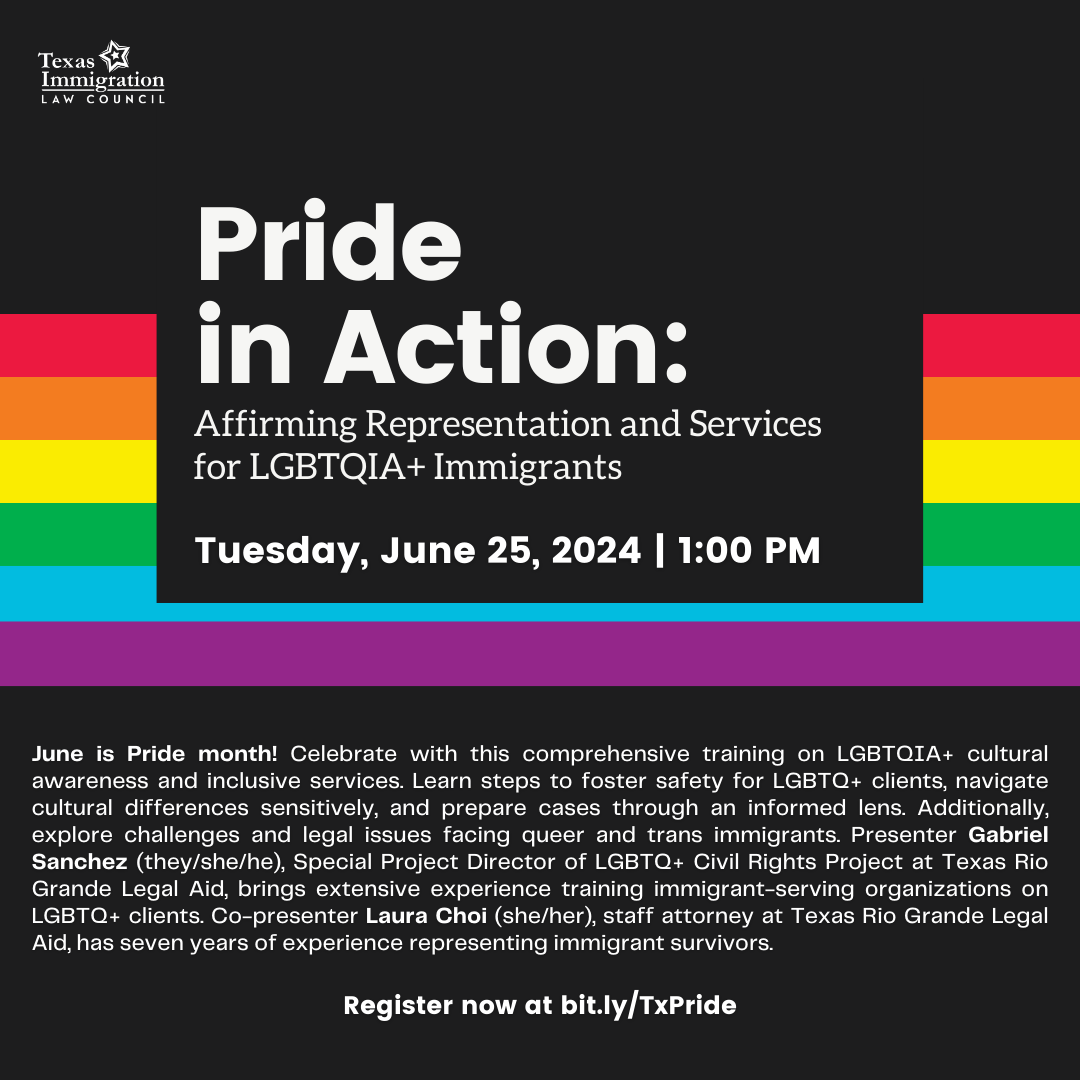 June is Pride month! Celebrate with this comprehensive training on LGBTQIA+ cultural awareness and inclusive services. Learn steps to foster safety for LGBTQ+ clients, navigate cultural differences sensitively, and prepare cases through an informed lens. Additionally, explore challenges and legal issues facing queer and trans immigrants. Presenter Gabriel Sanchez (they/she/he), Special Project Director of LGBTQ+ Civil Rights Project at Texas Rio Grande Legal Aid, brings extensive experience training immigrant-serving organizations on LGBTQ+ clients. Co-presenter Laura Choi (she/her), staff attorney at Texas Rio Grande Legal Aid, has seven years of experience representing immigrant survivors. Register here. |