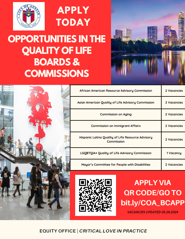 Boards and Commissions. Looking for ways to get involved in your community? Consider applying for a position on one of the City's many commissions! These bodies are important in that they enable the public to participate in Austin's government processes. Their activities help shape and influence public policy, because they lend a more diverse viewpoint for the City Council to consider. Check out the vacancies listed below and apply here. |