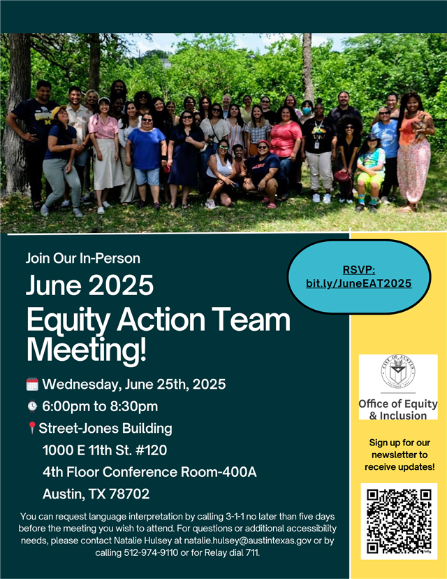 We are excited to have you for our in-person June 2025 EAT meeting! We'll connect over a light meal, and then get our meeting started by 6:30PM. *Spanish interpretation will be provided at this meeting. Please RSVP here.
