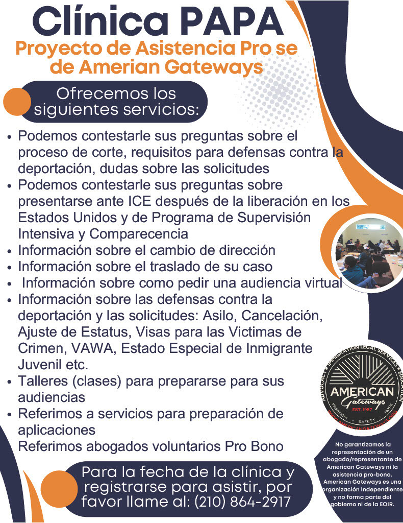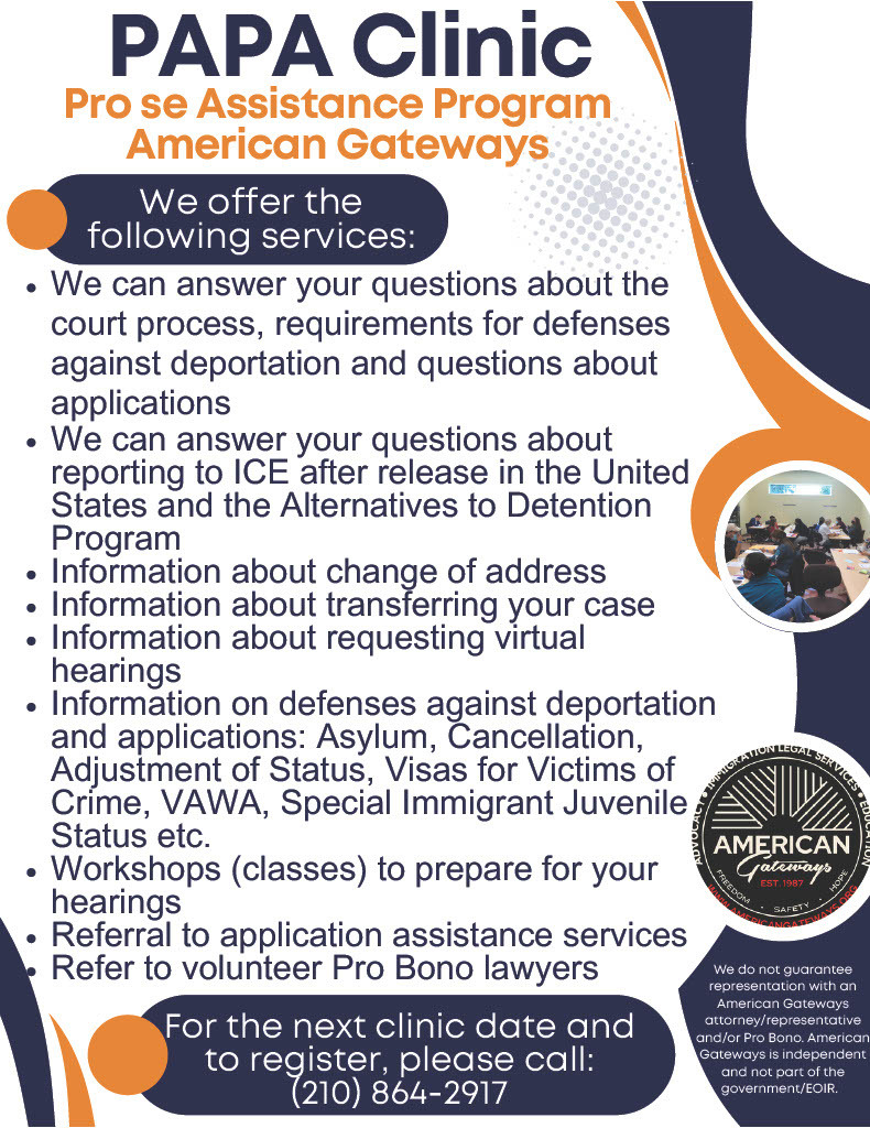 Immigration Legal Services. There is a growing community need for immigration legal services and a new program can help address the need. One of our partners, American Gateways, has launched the Pro Se Assistance Program (PAPA Clinic). Please review the flyers below for the services being offered.