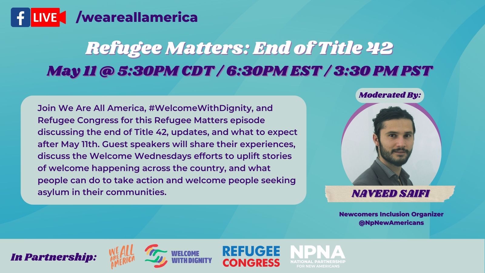 Join We Are All America, #WelcomeWithDignity and Refugee Congress for this Refugee Matters episode discussing the end of Title 42, updates and what to expect after May 11th. Guest speakers will share their experiences, discuss the Welcome Wednesdays efforts to uplift stories of welcome happening across the country, and what people can do to take action and welcome people seeking asylum in their communities. Register here. |