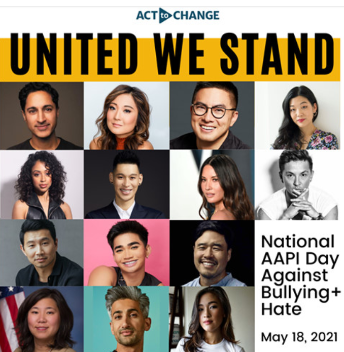 [Image Description: A square logo with the words "Act to Change" at the top. Beneath that it states in black text, "United We Stand" with a yellow highlighter color as the text's background. Below that is a collage of various Asian-Americans looking at the camera, posing. At the bottom right, it says in black text, "National AAPI Day Against Bullying+ Hate May 18 2021"] |