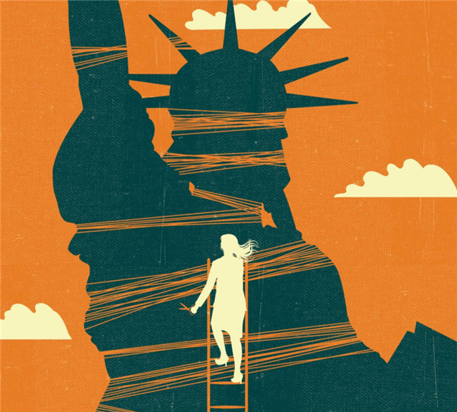 [Image Description: A digital image of the Statue of Liberty as a teal silhoutte with orange lines drawn through her. There is a person who is climbing a ladder with a cream silhoutte. The background is an orange sky with dispersed cream clouds.] |