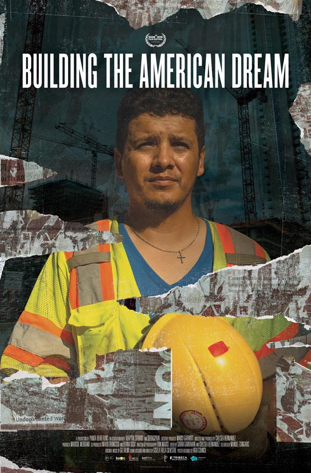 [Image Description: A movie poster with the face of a person squinting against the light. The person is wearing construction work gear and a gold necklace with a cross on it. Right above their head in white text it says, "Building the American Dream". At the bottom of the poster is text too small to read.] |