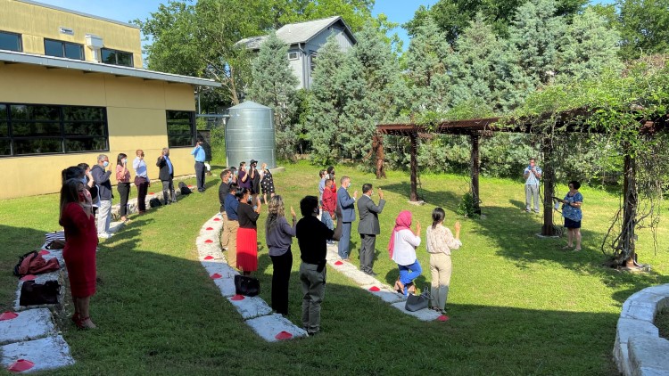 [Image Description: A photo of three rows of people standing with their right hand held up, level with their heads. There are stone benches planted in the greenery right behind each row of people, implying that they were sitting on the stone benches before getting up. Everyone is facing away from the camera, so only the back of their heads or side profiles can be seen. They are all facing a wooden gazebo. Under the wooden gazebo are two people, one is reading something off of what they're holding and another person seems to be recording the moment.] |