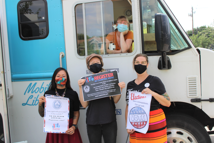 [Image Description: A photo of four people in the daytime. Three of them are standing side by side in front of a truck that is a mobile library. The fourth person is posing from inside the truck on the passenger side. Everyone is smiling and have on face masks. The three people standing side by side are holding posters that encourage people to vote.] |