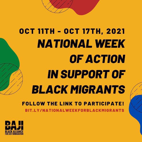 [Image Description: A digital flyer. At the top it reads "Oct 11th - Oct 17th, 2021." Below that, it reads, "National Week of Action in Support of Black Migrants. Follow the link to participate! bit.ly/nationalweekforblackmigrants" In the bottom left corner is the logo for BAJI - Black Alliance for Just Immigration.] |