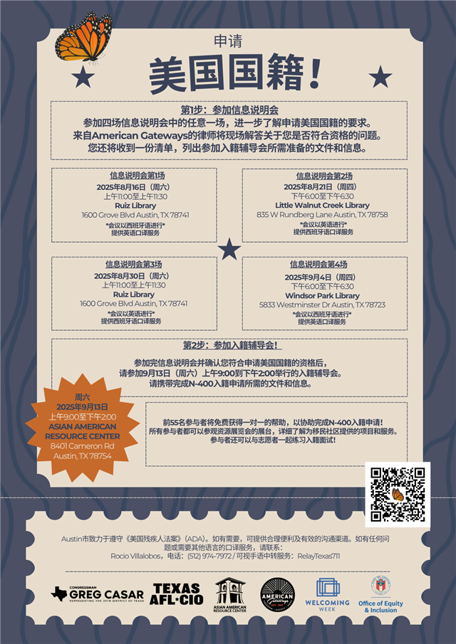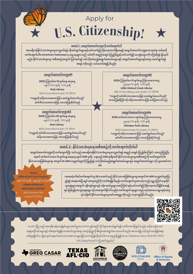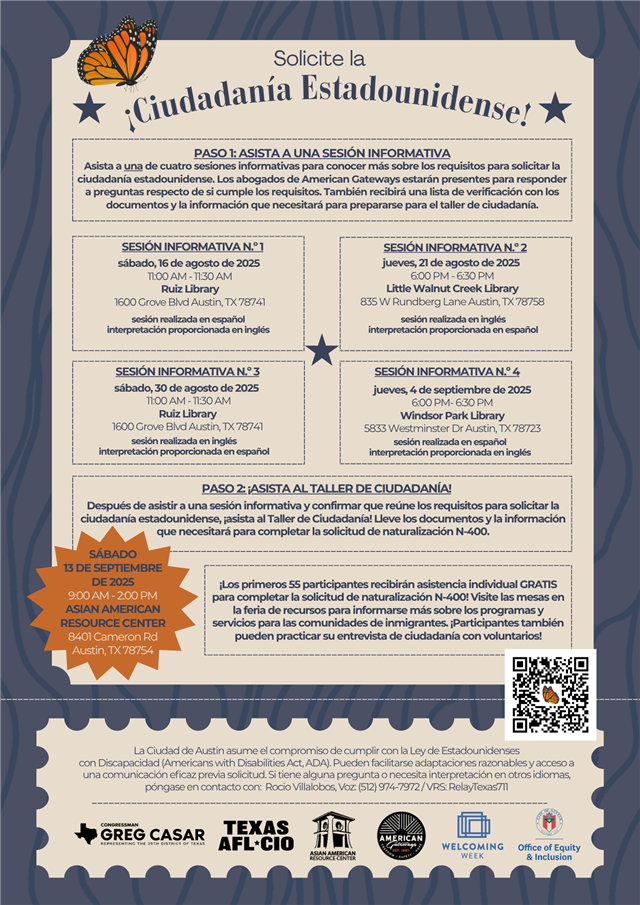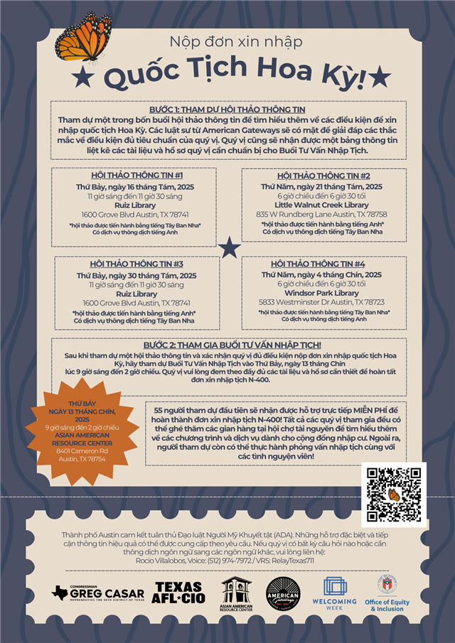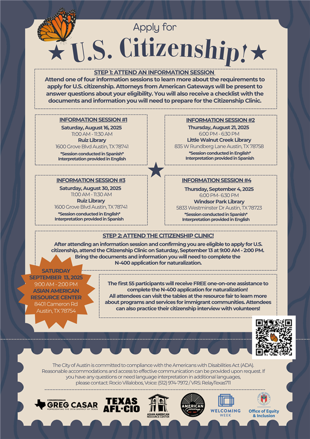 The Office of Equity and Inclusion is partnering with American Gateways, Texas AFL-CIO, Congressman Greg Casar's Office and the Asian American Resource Center to host a FREE citizenship clinic on Saturday, September 13.