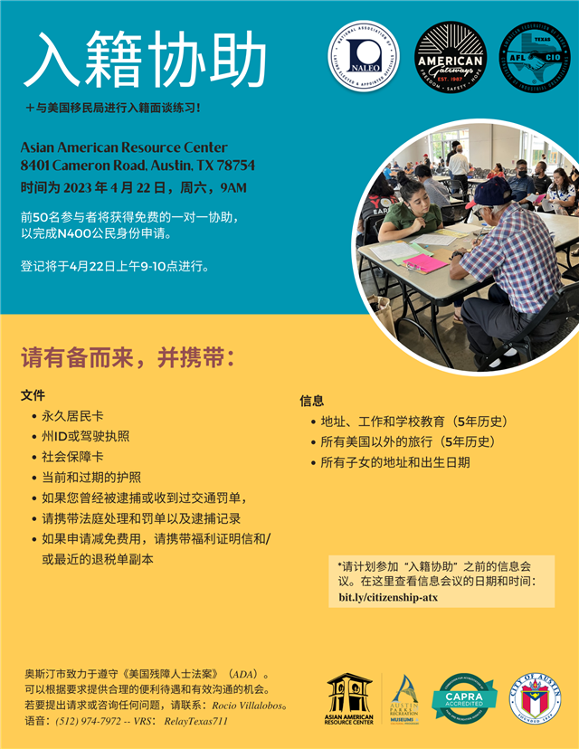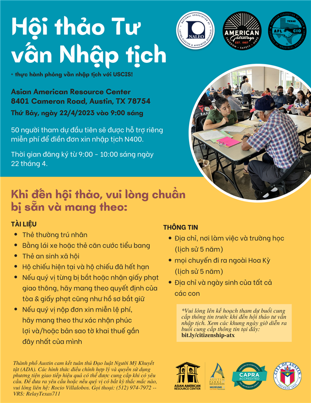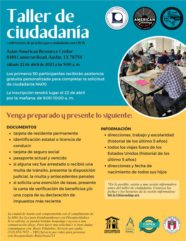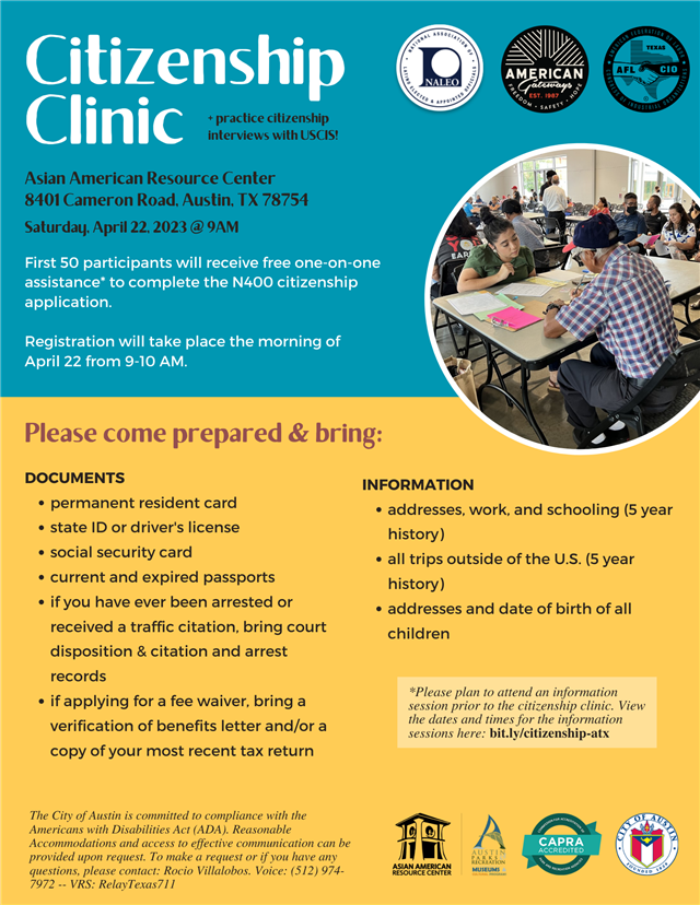 The City of Austin's Equity Office and Asian American Resource Center are partnering with NALEO, American Gateways, and Texas AFL-CIO to host a citizenship clinic on Saturday, April 22, 2023 at 9am. The first 50 participants will receive free one-on-one assistance to complete the N400 citizenship application. *Registration will take place from 9-10am the morning of April 22.