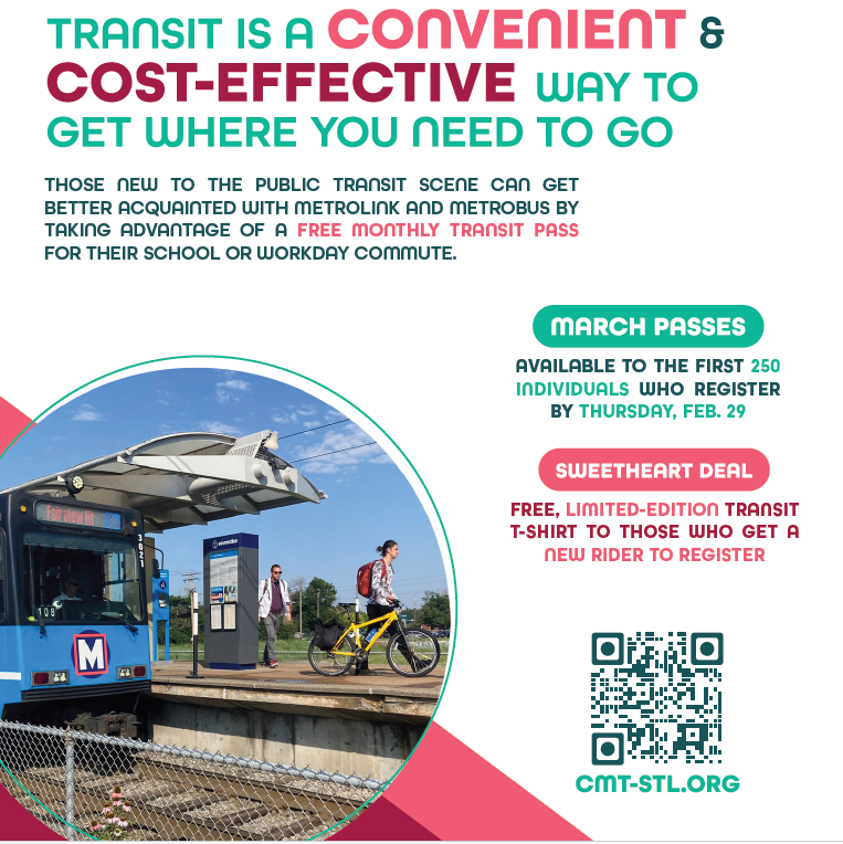 Citizens for Modern Transit – in conjunction with Metro Transit and St. Clair County Transit District – has launched a “Match with Metro Transit” campaign to encourage solo drivers to get better acquainted with MetroLink and MetroBus. Those new to the public transit scene can get a free monthly transit pass for their school or workday commute. March passes are available to the first 250 individuals who register online before Thursday, Feb. 29. |