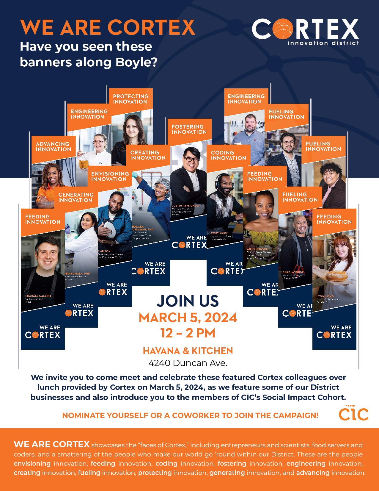 Cortex is proud to introduce our 2024 We Are Cortex campaign, beginning with 27 banners displayed along Boyle Avenue. We invite you to come meet and celebrate these featured Cortex colleagues at a lunch meet and greet on March 5, 2024, as we feature some of their businesses, as well as introduce you to the full CIC Social Impact Cohort. RSVP for lunch here.