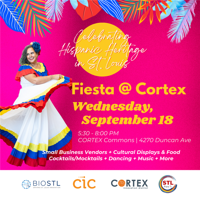 Discover, learn, and celebrate Hispanic Heritage Month with us for our 2nd annual Fiesta @ Cortex on September 18, 2024 from 5:30 - 8 p.m.! Join the festivities, shop small businesses, listen to Latin sounds by Big Papa G Entertainment, and engage with the vibrant Hispanic community as we come together for an enriching evening of cultural appreciation and unity. Be part of this memorable experience!