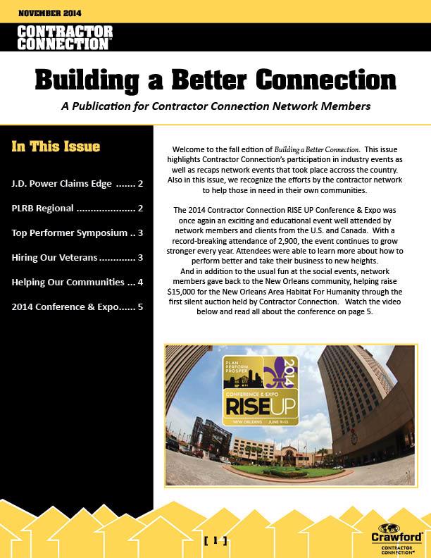 Welcome to the fall edtion of Building a Better Connection. This issue highlights Contractor Connection’s participation in industry events as well as recaps network events that took place accross the country. Also in this issue, we recognize the efforts by the contractor network to help those in need in their own communities.